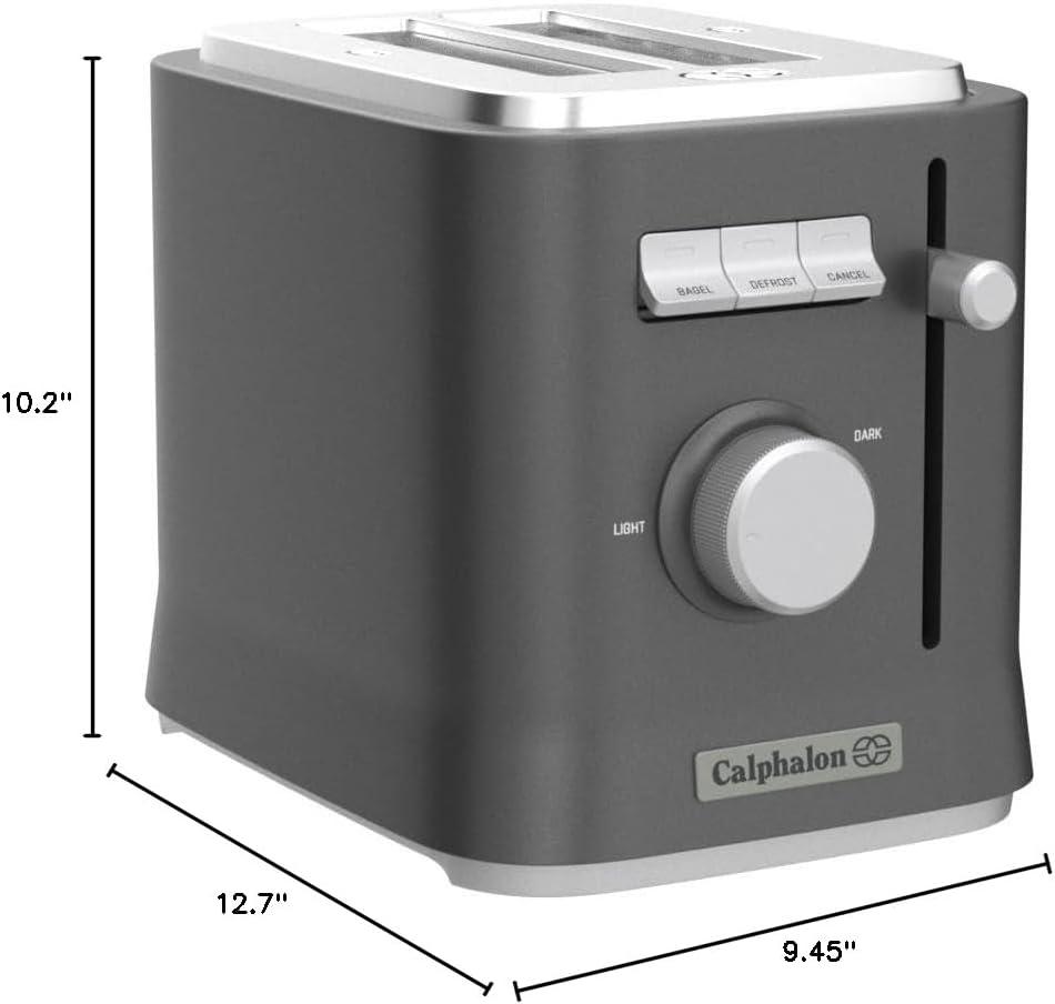 You can enjoy the perfect Texture and shade of toast with the Calphalon precision control 2 slice toaster. Advanced heat technology ensures consistent toasting every time. This bread toaster also includes guides that automatically position bread for more even exposure to heating elements, and extra-wide slots that accommodate a range of sizes and shapes. Six unique settings allow you to make toast The way you like it, from lightly toasted to dark and crispy. Countdown LED timer around shade dial lets you monitor toasting progress. When your toast is done, the toast lift lever elevates your slices for easy retrieval, and the removable crumb tray makes cleanup a Cinch.