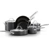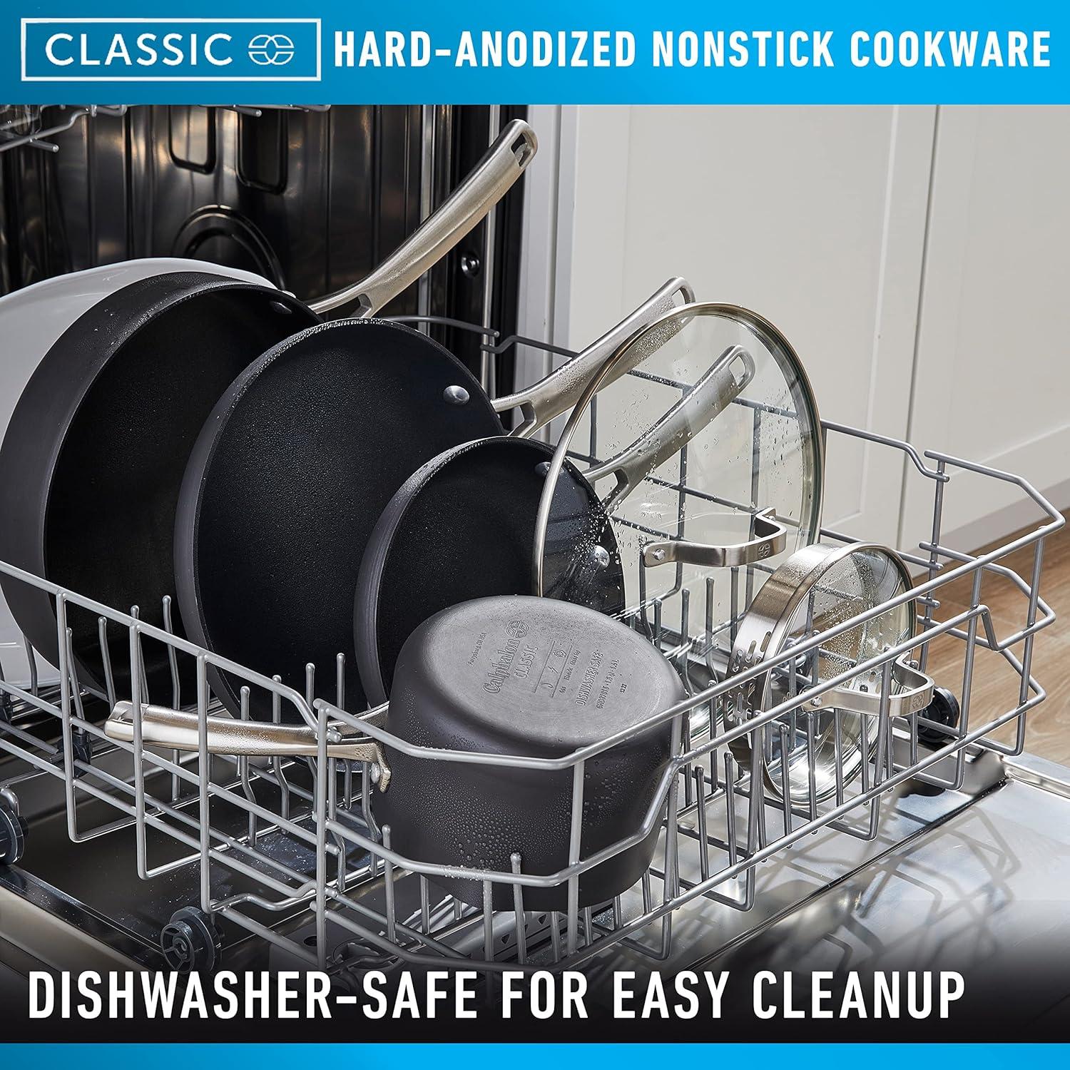 Designed to save you time in the kitchen, Calphalon Classic Hard-Anodized Nonstick Cookware delivers cooking versatility every step of the way with an improved* easy-release surface. Featuring AquaShield nonstick technology, this cookware line performs like new 40% longer* for remarkable food release over and over again. Made with water-based nonstick and a hard-anodized exterior, it's dishwasher-safe for quick cleanup. Convenient measuring marks, straining covers, and pour spouts allow you to cook efficiently. Long stainless steel handles make lifting and moving easy and stay cool on the stovetop. This nonstick cookware set is oven-safe up to 450 degrees F, so it can go from the stovetop into the oven for heating. Elevate your cooking experience with Calphalon Classic, and enjoy exceptional performance with endless possibilities. (*vs. previous generation of Calphalon Classic).