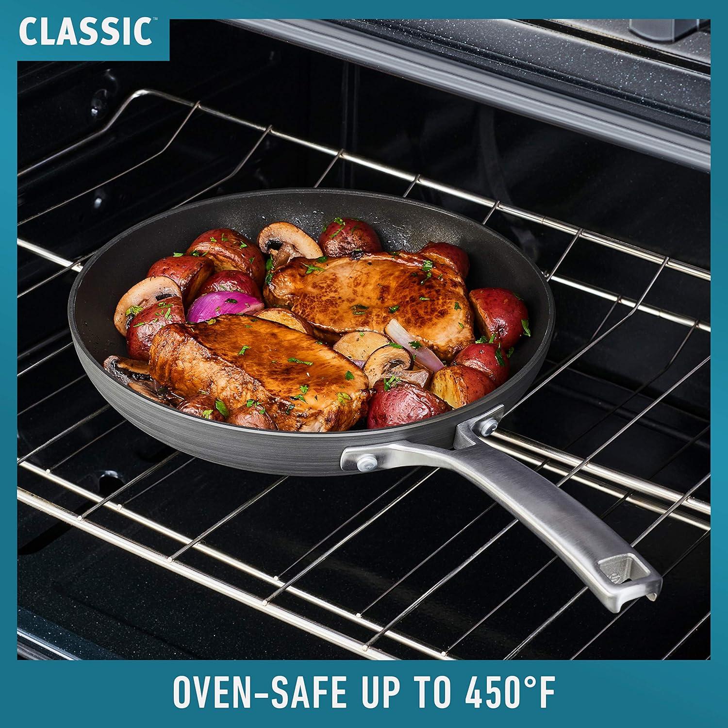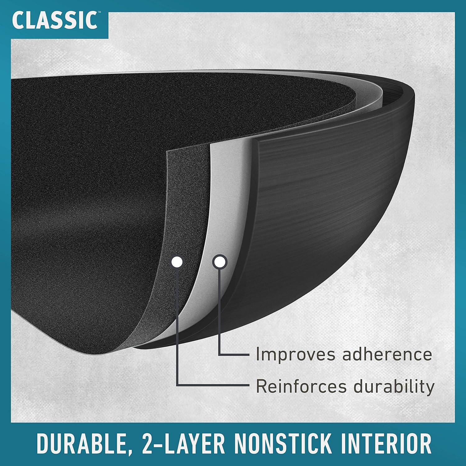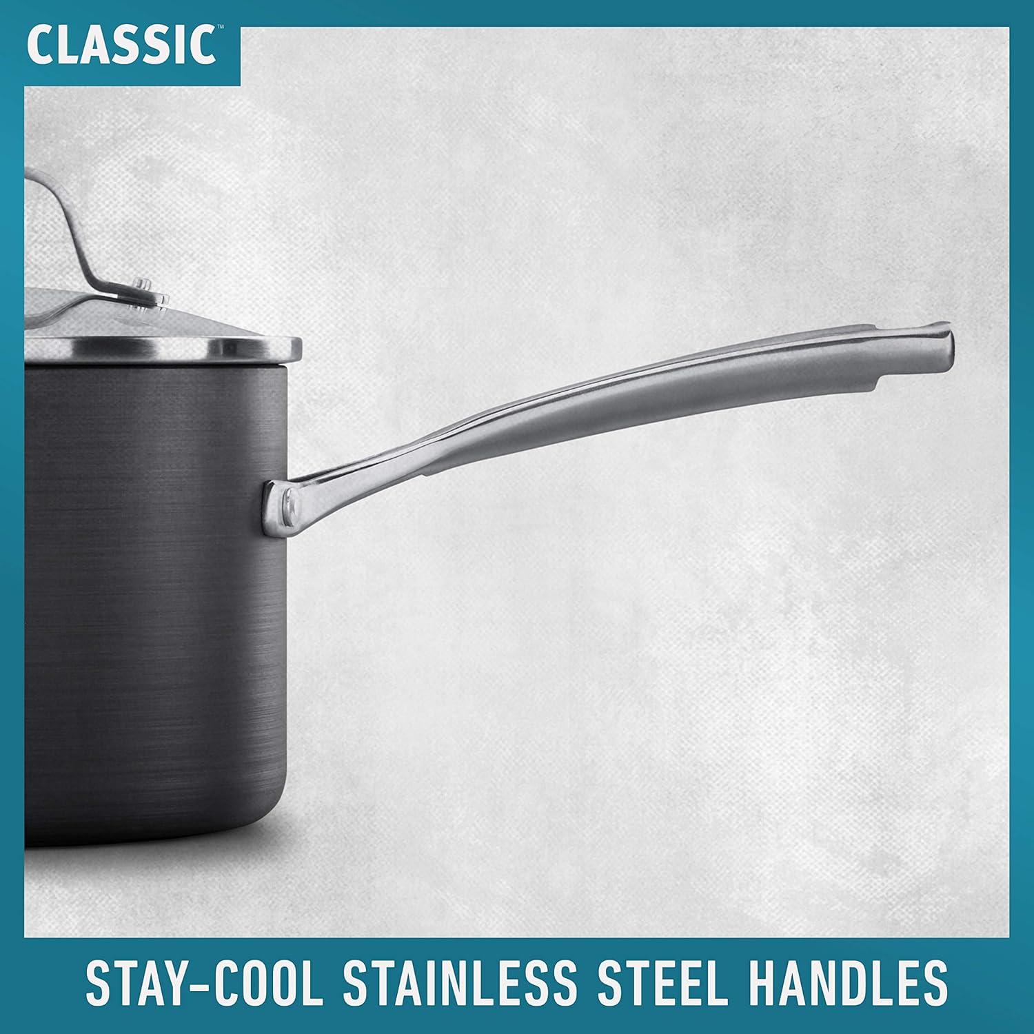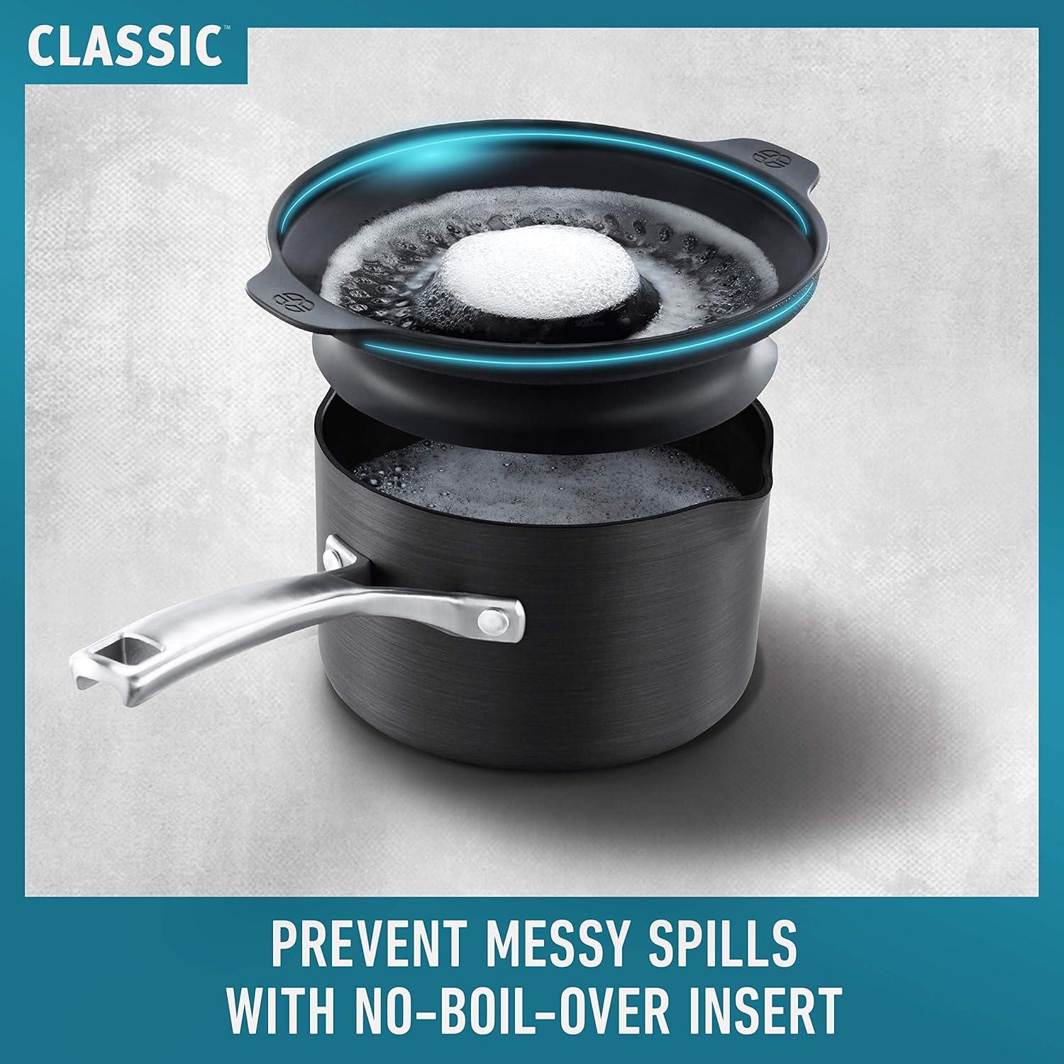 Designed to save you time in the kitchen, Calphalon Classic Hard-Anodized Nonstick Cookware delivers cooking versatility every step of the way with an improved* easy-release surface. Featuring AquaShield nonstick technology, this cookware line performs like new 40% longer* for remarkable food release over and over again. Made with water-based nonstick and a hard-anodized exterior, it's dishwasher-safe for quick cleanup. Convenient measuring marks, straining covers, and pour spouts allow you to cook efficiently, while included No-Boil-Over inserts prevent messes when making pasta, rice, potatoes, and beans. Long stainless steel handles make lifting and moving easy and stay cool on the stovetop. This nonstick cookware set is oven-safe up to 450 degrees F, so it can go from the stovetop into the oven for heating. Elevate your cooking experience with Calphalon Classic, and enjoy exceptional performance with endless possibilities. (*vs. previous generation of Calphalon Classic)
