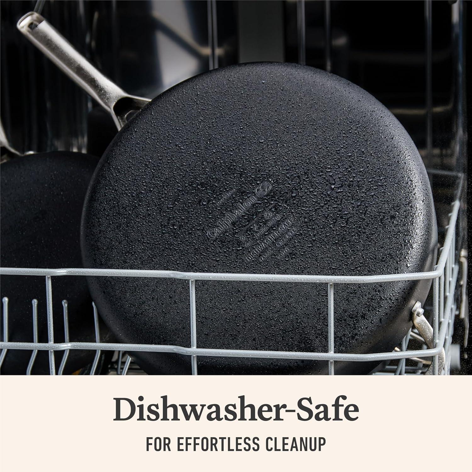 Designed to save you time in the kitchen, Calphalon Classic Hard-Anodized Nonstick Cookware delivers cooking versatility every step of the way with an improved* easy-release surface. Featuring AquaShield nonstick technology, this cookware line performs like new 40% longer* for remarkable food release over and over again. Made with water-based nonstick and a hard-anodized exterior, it's dishwasher-safe for quick cleanup. Convenient measuring marks, straining covers, and pour spouts allow you to cook efficiently. Long stainless steel handles make lifting and moving easy and stay cool on the stovetop. This nonstick saute pan is oven-safe up to 450 degrees F, so it can go from the stovetop into the oven for heating. Elevate your cooking experience with Calphalon Classic, and enjoy exceptional performance with endless possibilities. (*vs. previous generation of Calphalon Classic).