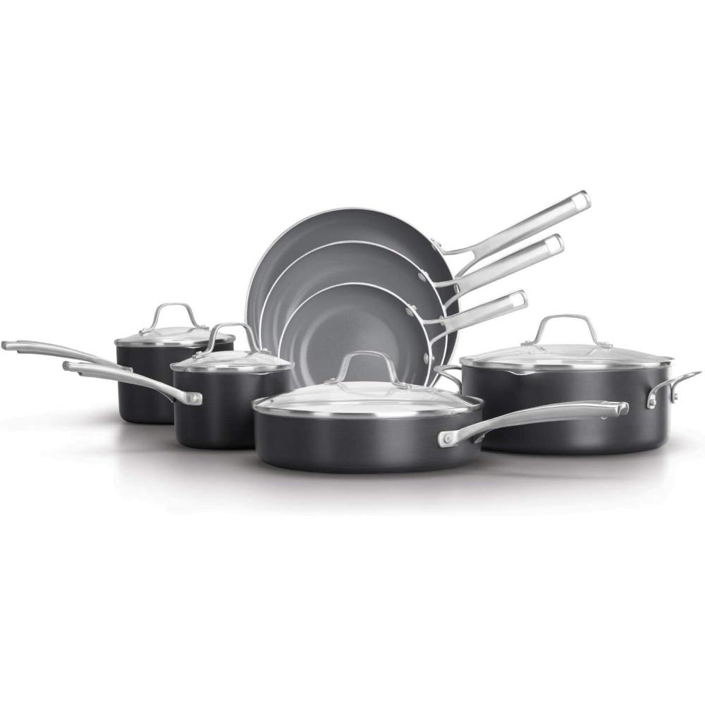 Let Calphalon help you get on the path to healthier cooking with Calphalon Classic Oil-Infused Ceramic Cookware. The PTFE- and PFOA-free cookware features an oil-infused ceramic coating that eliminates the need to add oil or butter, for health-conscious cooking and convenience. Durable, ceramic nonstick coating delivers 3x better nonstick release* for easy cleanup and long-lasting performance. Each piece of cookware is constructed from hard-anodized aluminum that provides fast and even heating for consistent cooking results you can count on. Calphalon Classic Oil-Infused Ceramic Cookware is also oven-safe up to 450 degrees F, to give you the flexibility to cook on the stovetop or in the oven, or both. When it comes to healthier eating and easier cooking, discover why cooks like you make it with Calphalon. *Than Calphalon Classic Ceramic. Designated Chemical Disclosure: This product contains Aluminum, Stainless Steel (Iron, Chromium, Nickel, Manganese, Copper, Phosphorus).