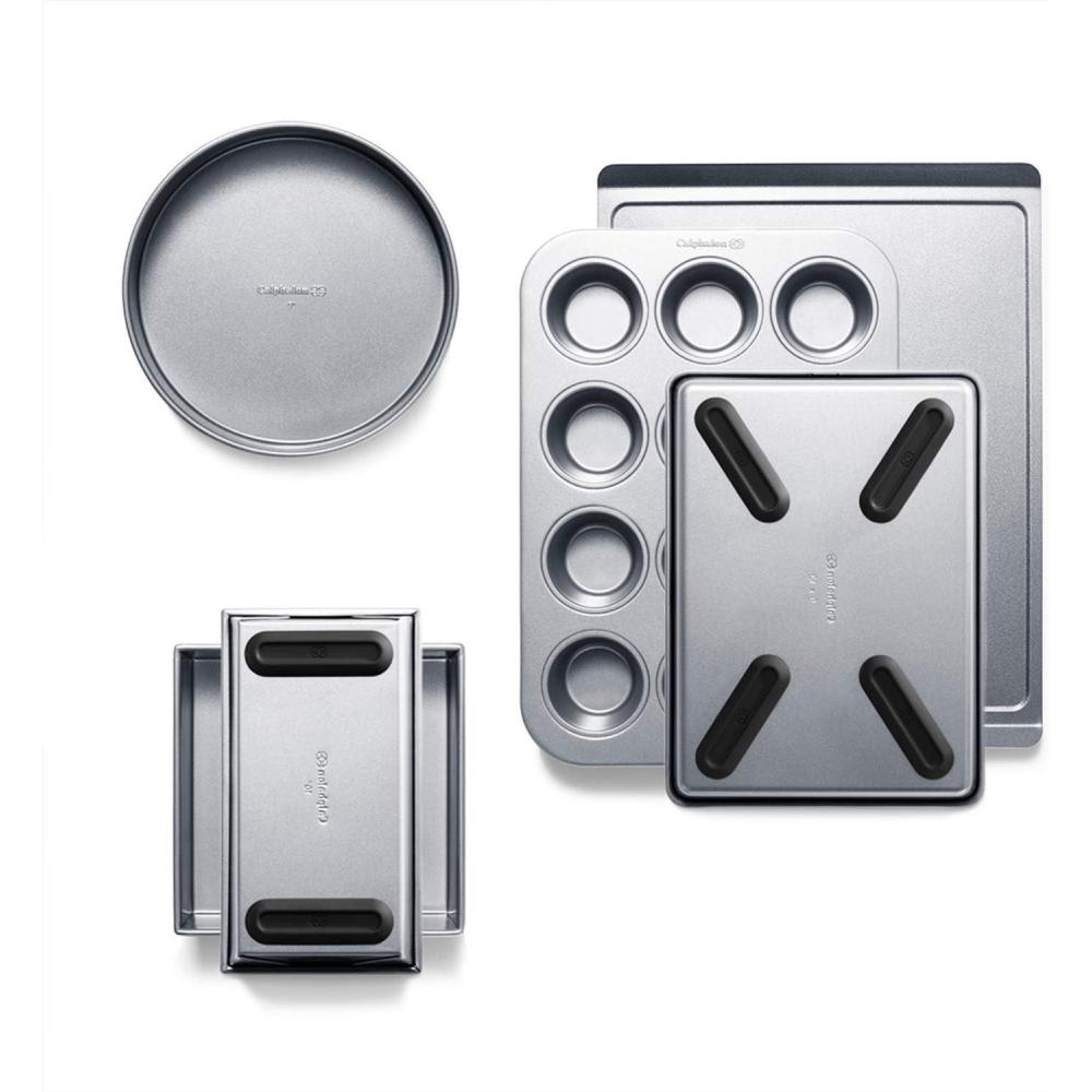 Includes large cookie sheet, 9-inch round cake pan, 9×13-inch brownie pan, 5X10-inch large loaf pan, 8-inch square cake pan, 12-cup muffin pan
