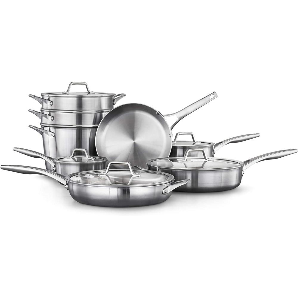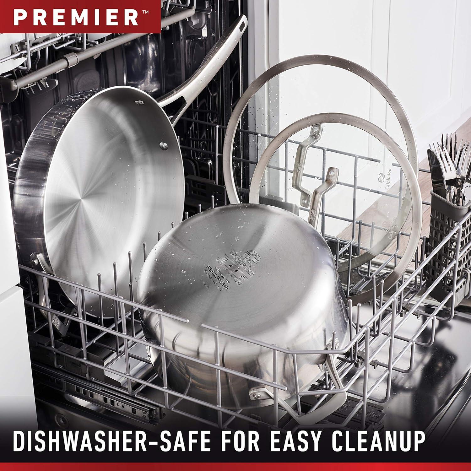 Calphalon Premier Stainless Steel Cookware delivers precision cooking performance, with an elegant, classic look that will inspire any chef. The 3-layer metal construction features a heavy-gauge aluminum core that distributes heat evenly and allows you to brown, sear, and saute with consistency and confidence. The elegant stainless steel finish is dishwasher-safe for easy cleanup. Calphalon Premier Stainless Steel Cookware is oven-safe up to 450 degrees F so it can go from the stovetop to the oven for heating and cooking versatility. Unlock your culinary genius with Calphalon Premier, and experience superior cookware that's built to last. Designated Chemical Disclosure: This product contains Aluminum, Stainless Steel (Iron, Chromium, Nickel, Manganese, Copper, Phosphorus).