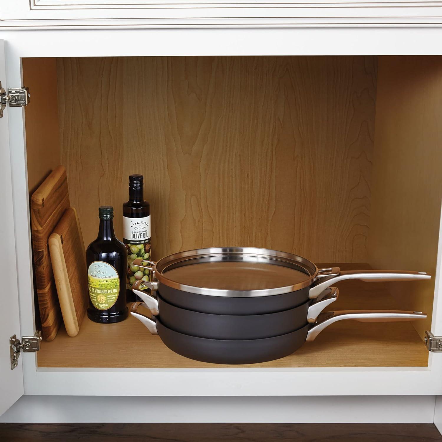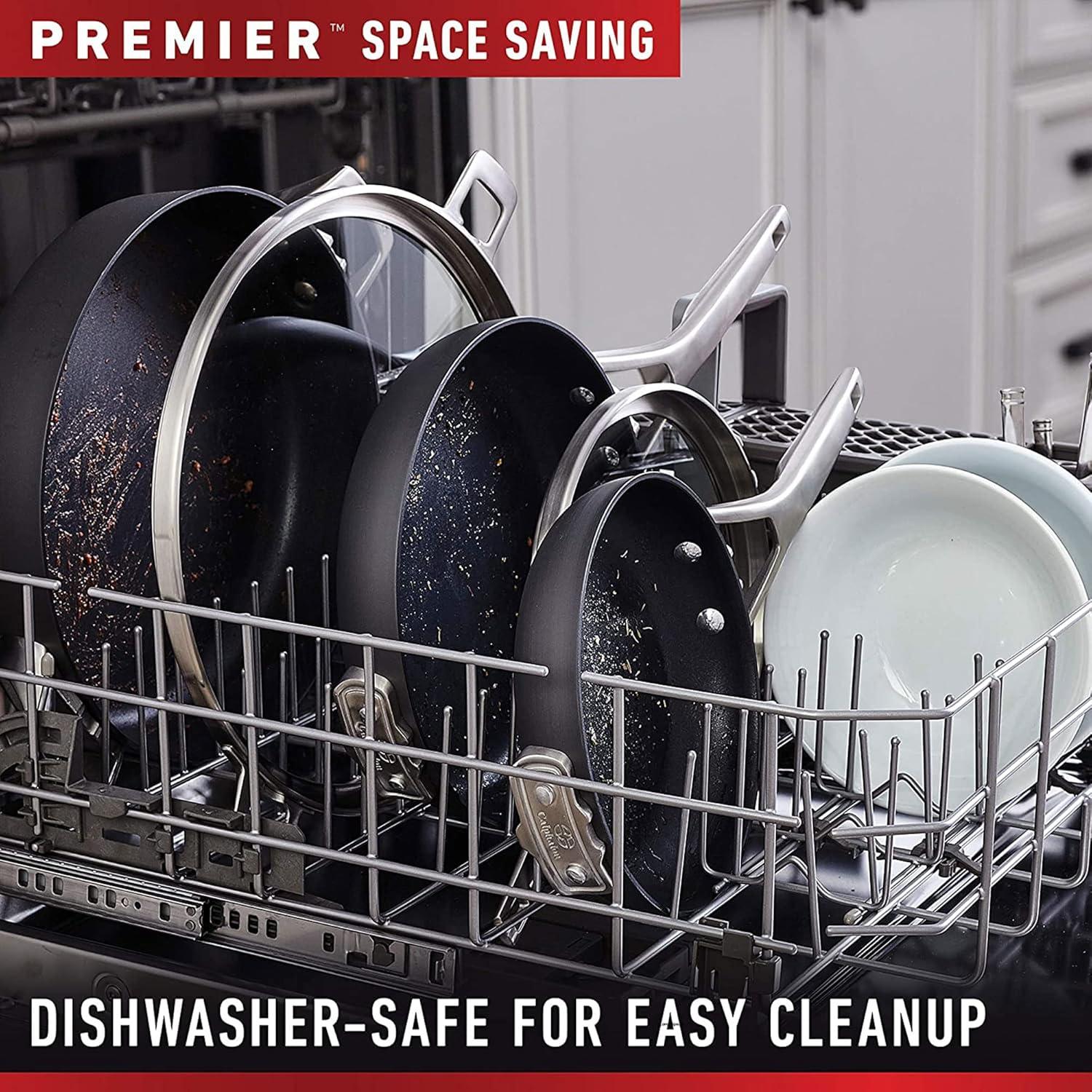 Featuring MineralShield nonstick technology, Calphalon Premier Space-Saving Hard-Anodized Nonstick Cookware is now 5x more durable than before when compared to the previous generation of Calphalon Classic. This nonstick sauce pan delivers long-lasting performance for effortless food release, so you can cook with confidence and serve even the most delicate food with ease. This space-saving line also securely stacks to save 30% more space than its non-stacking counterparts. Thanks to their unique design and flat glass covers, the pots and pans stack and nest in any order when stored on other items of the same diameter. A 3-layer nonstick interior is made with some of the Earth's hardest minerals to withstand metal utensils and everyday use and the hard-anodized exterior is dishwasher-safe for easy cleanup. They are oven-safe up to 450 degrees F, able to go from the stovetop into the oven for heating and cooking versatility. Elevate your cooking experience with Calphalon Premier, and enjoy exceptional performance with endless possibilities.