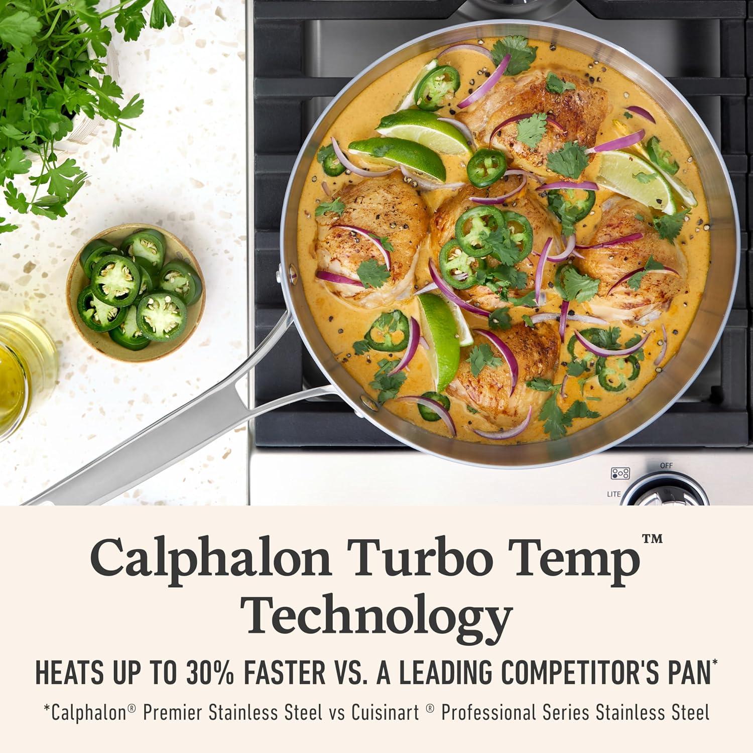 Designed for home chefs who value quality and performance, the Calphalon Premier Stainless Steel 4.5-Quart Chef's Pan with Lid is built for precision cooking and lasting durability. Engineered with ultra-durable, non-toxic, 5-layer construction and heat-responsive aluminum core, this pan features Calphalon Turbo Temp™ technology and heats up to 30% faster, so you can getting cooking faster.* From delicate sauces to high-heat searing, this cooking pan delivers flawless results for crowd-pleasing meals. The brushed stainless steel finish adds a professional touch to your kitchen, while its oven-safe, all-stovetop compatibility ensures effortless cooking from start to finish. Cook with ease and bring restaurant-quality performance to your kitchen with Calphalon Premier Stainless Steel cookware. (*Calphalon Premier Stainless Steel vs. Cuisinart Professional Series Stainless Steel)